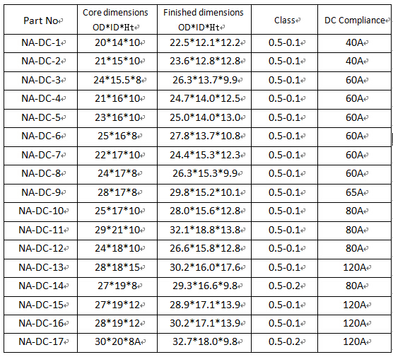 4. Standard cores dimensions, Applicable CT accuracy ,Maxima DC current immunity range :